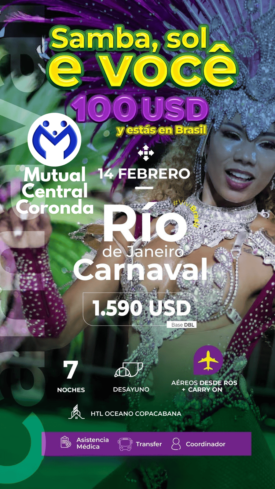 El verano de 2026 se tiñe de brillo, ritmo y la energía inigualable de Río de Janeiro. El famoso Carnaval de Río te espera, y con este paquete exclusivo de Mutual Central Coronda, tu única preocupación será elegir tu mejor disfraz.